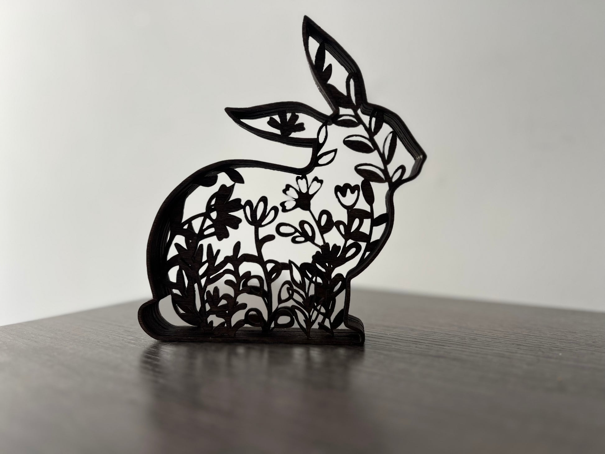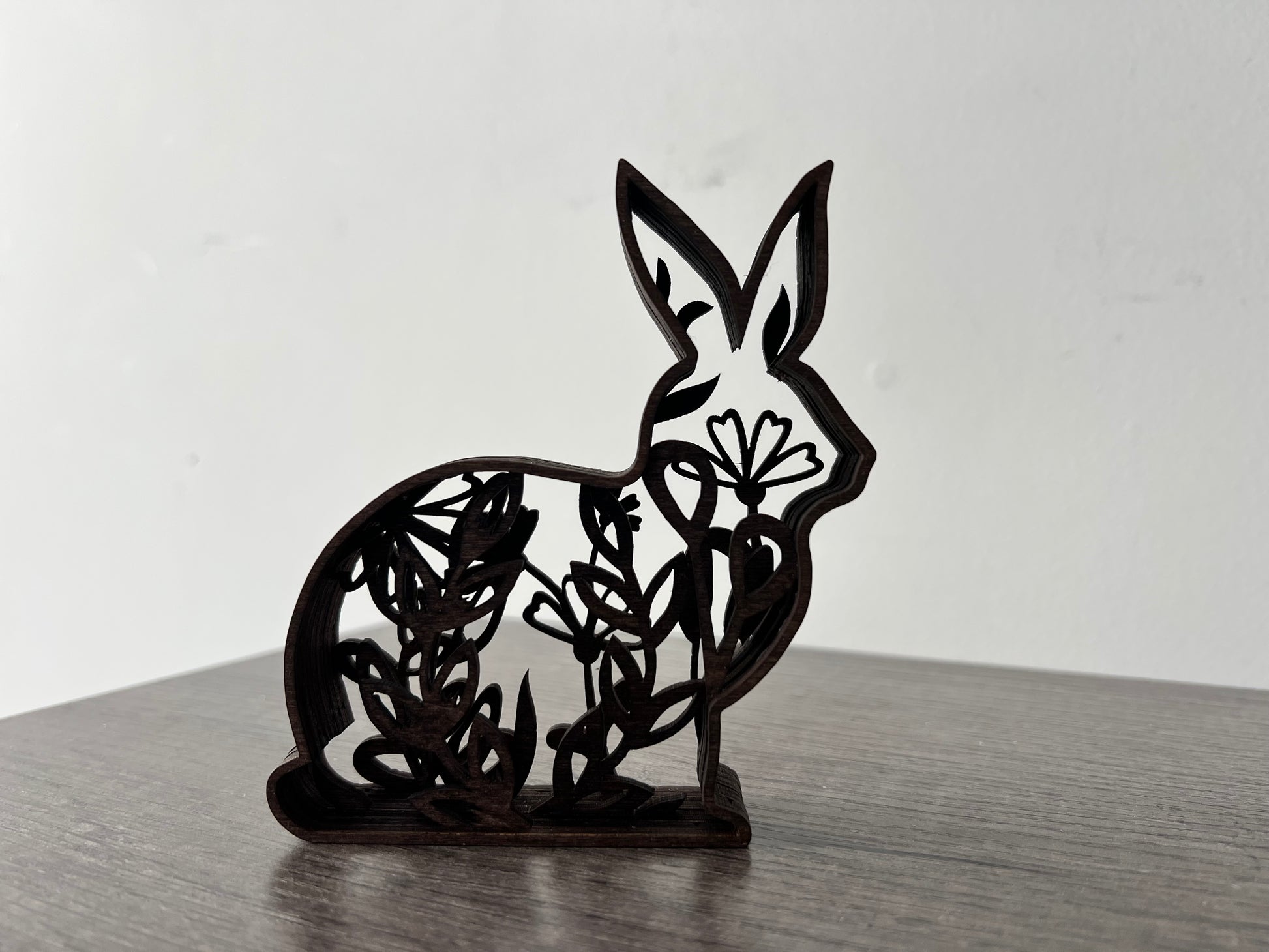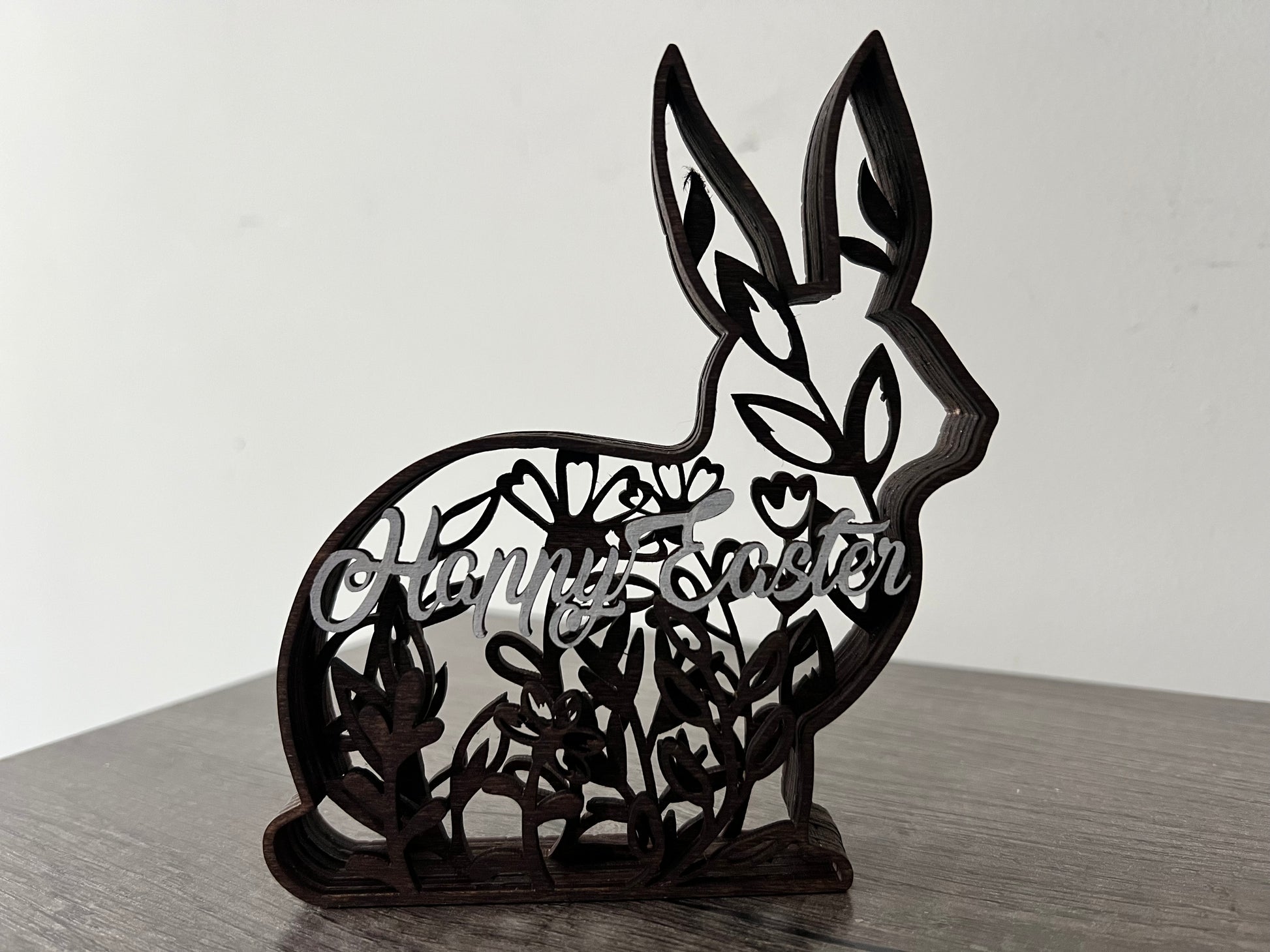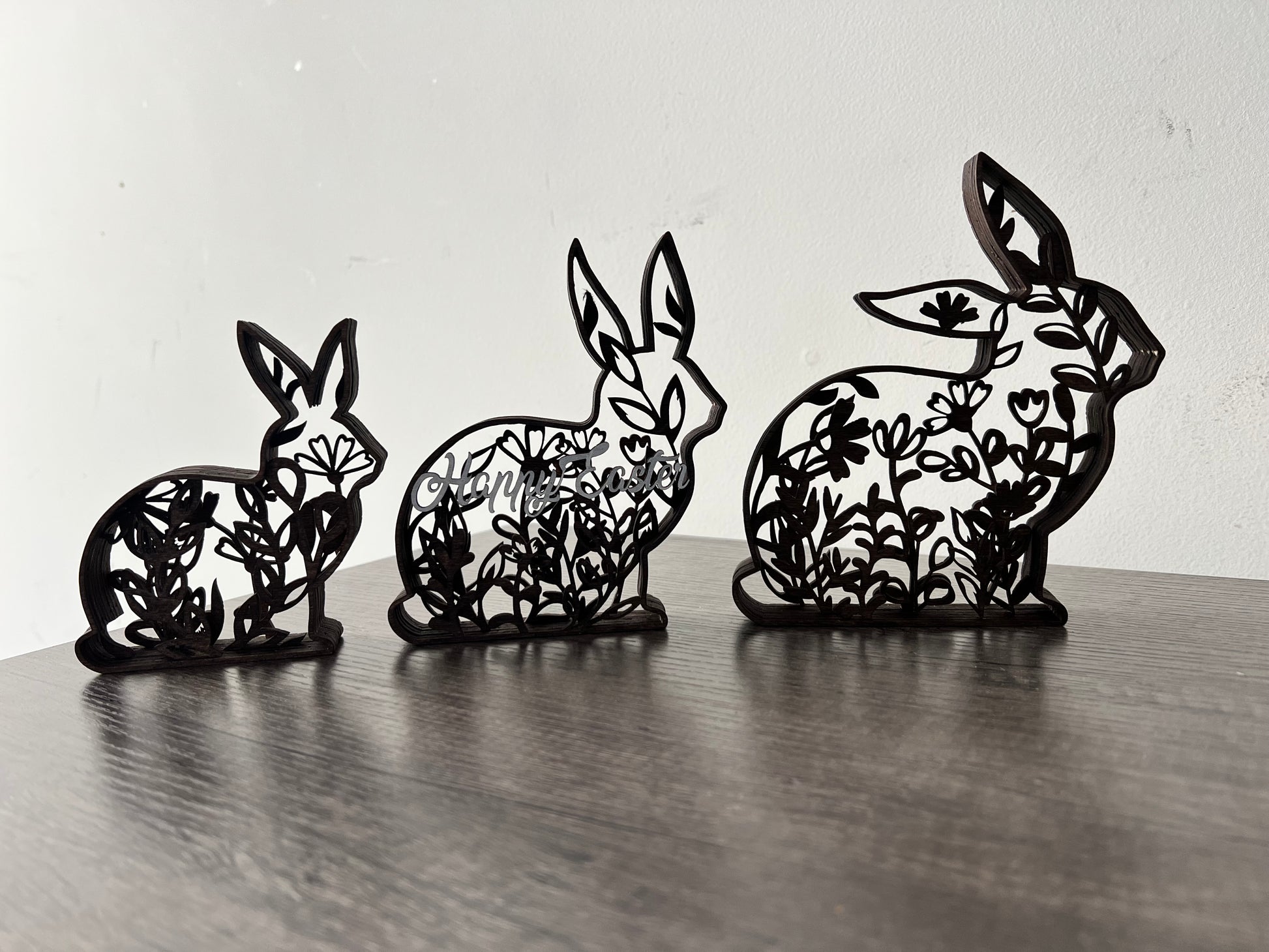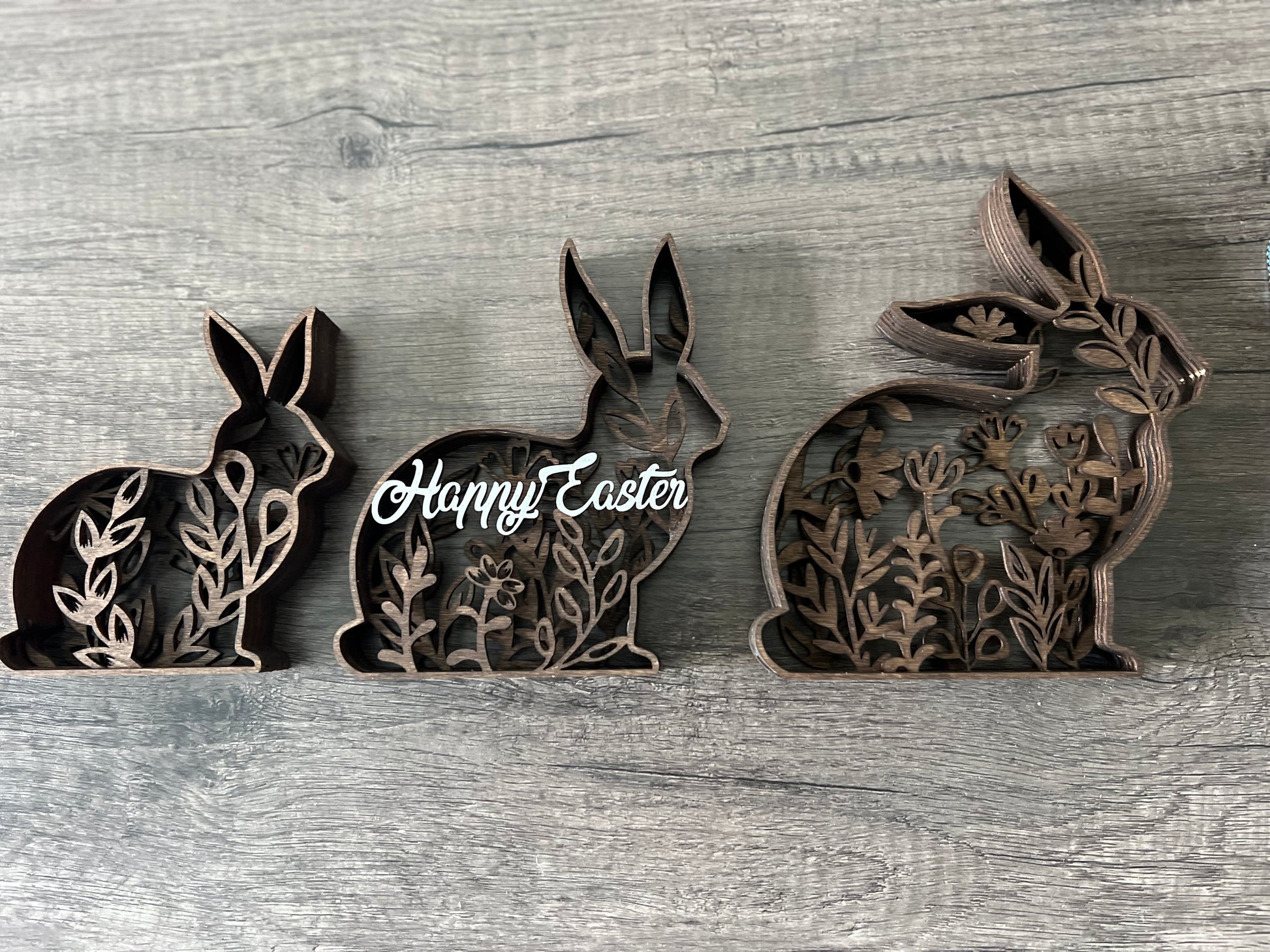 Add these cute layered bunnies to your Easter home decor! Each bunny is made of stained wood, with 7 layers each. They stand alone, come as a set of 3, and are each a different size.