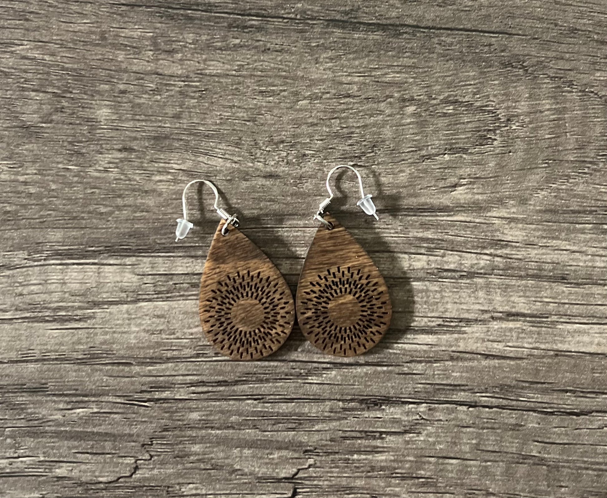 These dangle earrings are made of wood and stained. They measure 2 inches from top to bottom. Perfect for spring and summer! Made with hypoallergenic hooks.